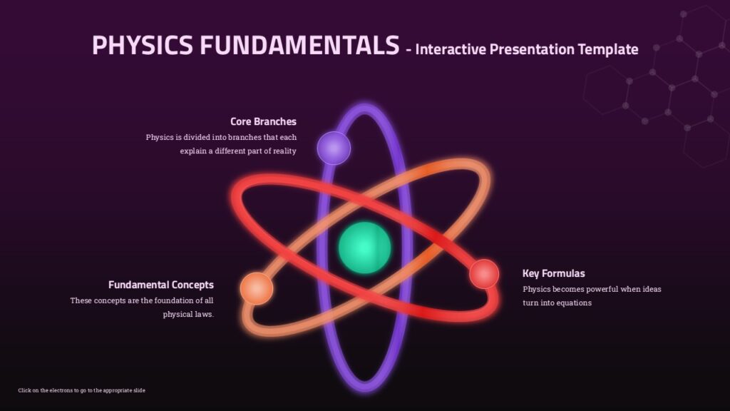 This Physics Fundamentals Presentation Template for PowerPoint & Google Slides provides an interactive atomic-themed design with a vibrant purple background and neon accents. The template features an innovative navigation hub with orbital rings and colored spheres, clean list layouts with icon-enhanced bullet points, and teal content panels. Each slide maintains visual consistency while covering core physics branches, fundamental concepts, and key mathematical formulas with clear, educational formatting.