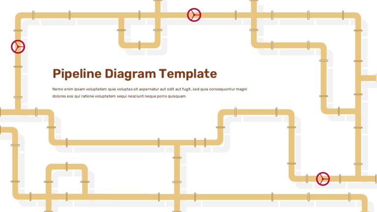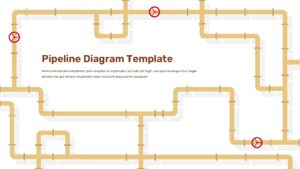 This Pipeline Infographic Template for PowerPoint & Google Slides provides a sophisticated visual representation of interconnected pipeline systems with realistic 3D-style rendering. The design features intricate networks of golden-bronze colored pipelines forming decorative borders around central content areas, complete with authentic joints, connectors, and directional flow indicators. Three prominent red valve controls are strategically positioned throughout the pipeline network, while the template offers both light and dark background variants to suit different presentation aesthetics and branding requirements.