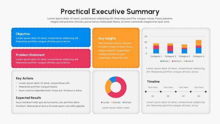 This Practical Executive Summary Template for PowerPoint & Google Slides provides a comprehensive dashboard-style layout with six strategically arranged sections. Features vibrant accent colors including bright blue, coral pink, and orange against professional light and dark theme options. Includes stacked bar charts, donut charts, and horizontal timelines with clean typography, rounded content blocks, and modern flat design elements for optimal information flow.