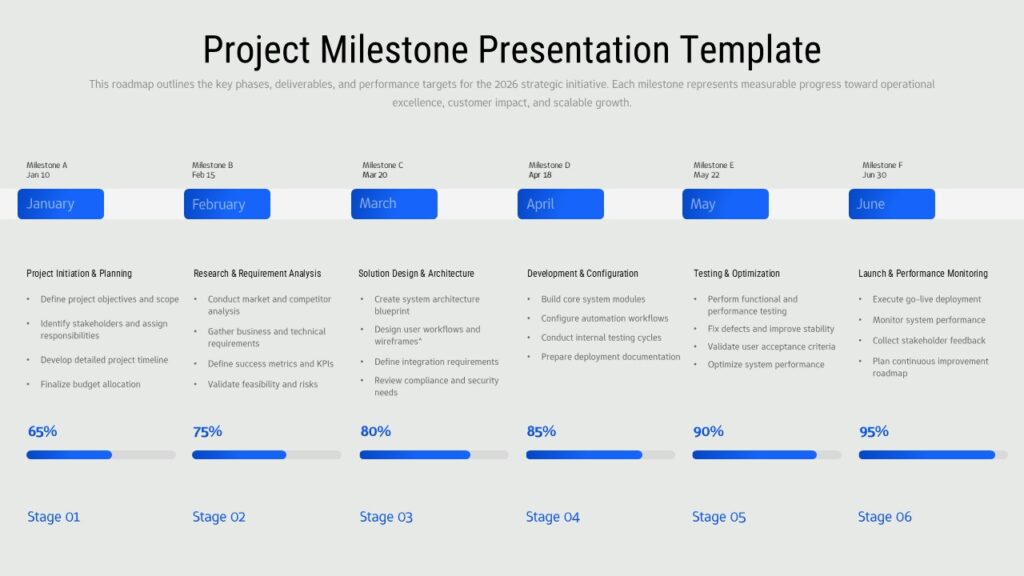 This Project Milestone Presentation Template for PowerPoint & Google Slides provides a comprehensive 6-column horizontal timeline layout spanning January through June. The template features clean milestone columns with bright blue accent colors, progress indicators showing completion percentages from 65% to 95%, and stage labels for each phase. Available in both light and dark background variations, the design maintains a professional corporate aesthetic with modern typography and organized grid structure that clearly visualizes project progression.