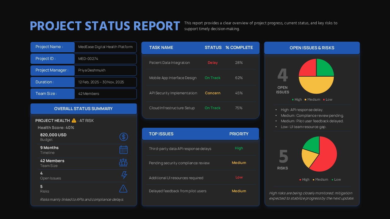 This Project Status Report presentation template provides a clear, executive-ready snapshot of project progress, health, and risk. It presents all key information within a single, well-structured slide. The layout combines project details, task tracking, issue prioritization, and risk visualization in a balanced dashboard. As a result, it supports fast and informed decision-making. Clearly labeled sections cover project metadata, overall status, task completion, and open issues. This structure allows stakeholders to quickly understand the current project position. Visual indicators, icons, and charts further enhance clarity without overwhelming the audience.