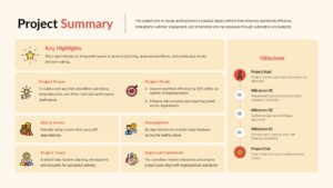 This makes it ideal for status updates, kick-off meetings, and stakeholder briefings. The project summary overview dashboard template also integrates a vertical milestone timeline that visually tracks progress from project start to completion. Each milestone is clearly numbered and labeled, allowing audiences to quickly understand sequencing and delivery phases. Supporting panels highlight key highlights, goals, and team responsibilities, ensuring both strategic intent and execution details are communicated together.