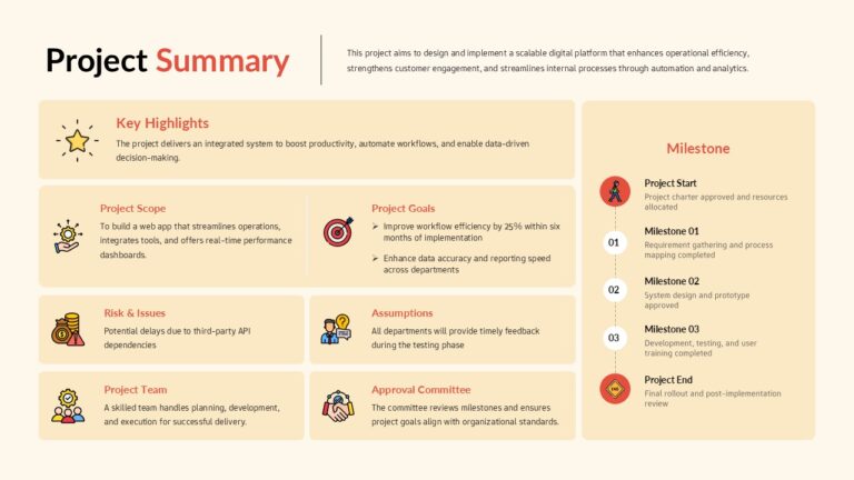 This project summary overview dashboard template is designed to present essential project information in a clear, structured, and executive-friendly layout. The slide combines key project components—such as objectives, scope, risks, assumptions, and governance—into a single cohesive view that supports fast understanding and informed decision-making. Distinct content blocks with icons and headings help guide attention, while the balanced layout ensures that no single section overwhelms the narrative.