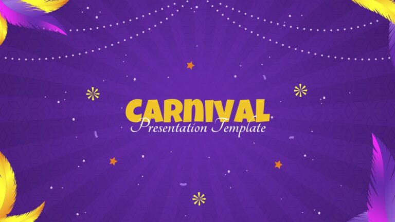 Bring energy and festivity to your slides with this Carnival Celebration Background Template for PowerPoint & Google Slides. Designed with a bold purple backdrop, golden headline typography, and decorative carnival elements, this presentation layout instantly captures attention. The background features colorful feathers in gradient shades, sparkling star icons, dotted light garlands, and subtle geometric patterns that add depth without distracting from your content. The large central title area ensures your key message stands out clearly, making it ideal for event announcements, festival programs, and themed presentations.