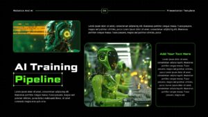 This Robotics and AI presentation template is crafted to deliver high-impact technology narratives with a futuristic and professional visual style. Designed as a multi-slide deck, it covers core topics such as AI training pipelines, intelligent machine evolution, robotics system architecture, robot types, and industry deployment insights. The dark background combined with neon green highlights creates a strong tech-driven atmosphere, making complex Robotics and Artificial Intelligence concepts visually engaging and easy to follow.