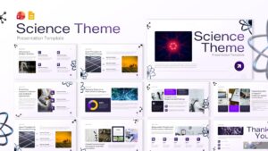 This Science Theme Presentation Template for PowerPoint & Google Slides provides a sophisticated design featuring molecular structure graphics and purple accents on clean white backgrounds. The 11-slide template includes scientific imagery, data visualization elements, timeline layouts, and icon-based content blocks. Each slide incorporates laboratory equipment, research settings, and analytical graphics to support scientific content delivery with professional visual appeal.