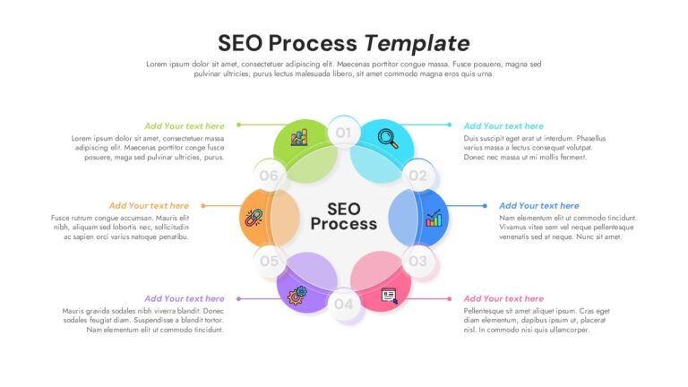 This SEO process cycle diagram template is designed to visually explain the complete search engine optimization workflow in a structured and engaging way. The slide uses a circular layout with six connected segments surrounding a central “SEO Process” core, clearly illustrating how each stage contributes to long-term search performance. Each step is represented by a color-coded shape with a matching icon, making the SEO process cycle easy to follow and visually balanced.