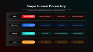 Present your operational workflow with clarity using this Simple Business Process Map Flow Template for PowerPoint & Google Slides. Designed to visualize cross-functional collaboration, this business process map slide organizes tasks into four horizontal lanes: Sales, Department, Manager, and Admin. Each row highlights a key action in a bold, color-accented capsule—Receive request, Review request, Review output, and Deliver to customer—followed by sequential supporting steps connected with directional arrows.