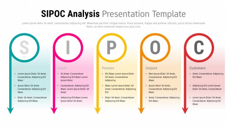 The SIPOC Analysis Process Diagram Template for PowerPoint & Google Slides uses bold circular headers labeled S, I, P, O, and C, paired with color-coded columns to differentiate each section instantly. Teal highlights Suppliers, pink emphasizes Inputs, yellow defines Process, orange represents Outputs, and red distinguishes Customers. Beneath each heading, bullet point placeholders allow you to outline key stakeholders, required resources, workflow steps, deliverables, and target audiences in a structured format. The subtle grid background and modern typography enhance readability without distracting from your content.