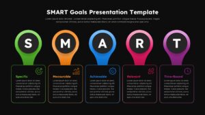 This SMART Goals infographic slide is designed to clearly communicate goal-setting frameworks in a visually structured and engaging format. The layout presents the five SMART criteria Specific, Measurable, Achievable, Relevant, and Time-Bound in five vertically aligned, color-coded pillars. Each pillar features a bold letter marker, intuitive icon, headline, and supporting text area, allowing presenters to explain each concept step by step while maintaining visual consistency. The clean white background ensures readability, while the rounded shapes and gradient accents add a modern, professional finish suitable for business and educational use.