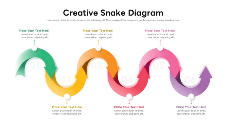 This Snake Diagram Template for PowerPoint & Google Slides provides a visually engaging three-step process flow with connected circular elements. Each circle features numbered sections (01-06) arranged in a flowing snake-like progression from left to right. The template includes vibrant gradient colors transitioning from green to yellow, orange to yellow, and pink to red, creating an eye-catching visual hierarchy. Six strategically placed text placeholders allow for comprehensive content organization with clean, balanced spacing throughout.
