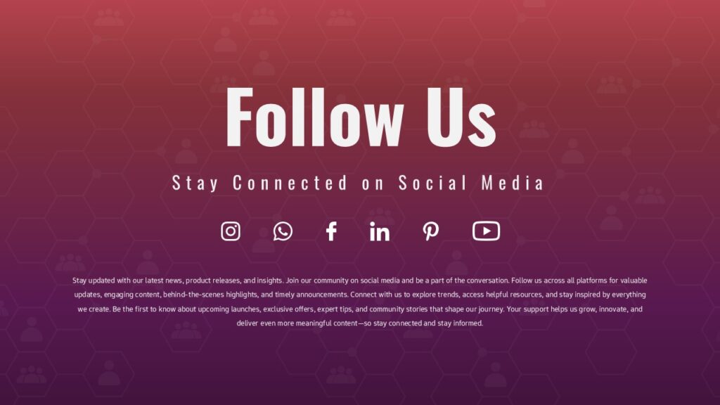 This Social Media Follow Us Call-to-Action Slide Template for PowerPoint & Google Slides is designed to help brands, teams, and organizations promote their online presence with clarity and visual impact. Featuring a smooth red-to-purple gradient background, subtle hexagonal patterns, and clean white iconography, the layout creates an inviting and modern aesthetic that aligns well with digital branding. The slide includes dedicated icons for major platforms—including Instagram, WhatsApp, Facebook, LinkedIn, Pinterest, and YouTube—ensuring your audience can instantly recognize the channels where they can stay connected.