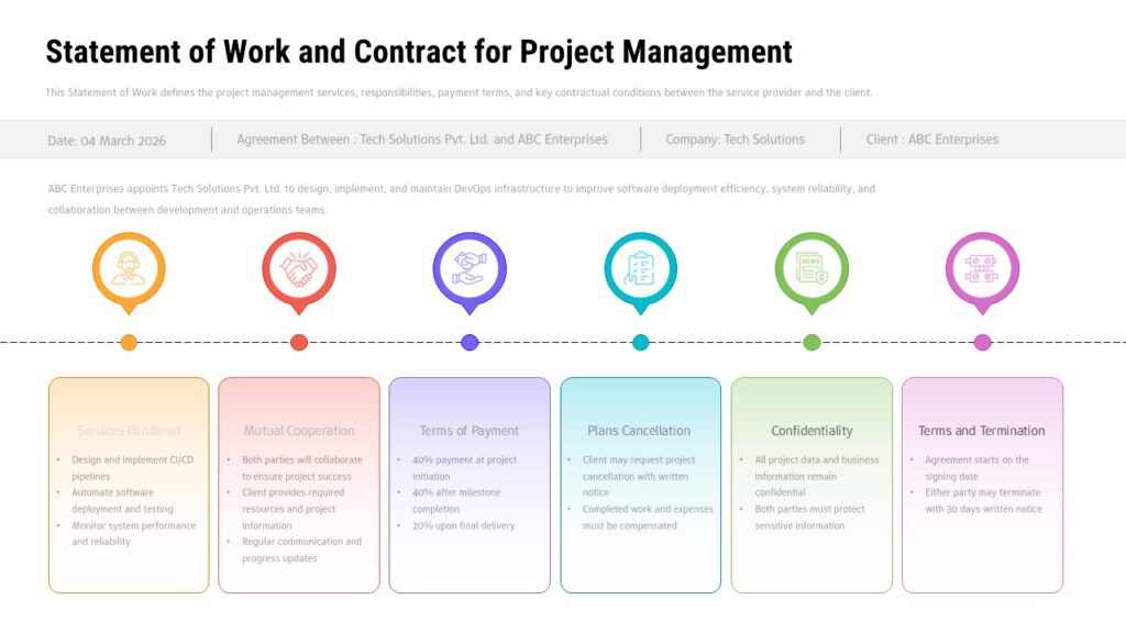 This Statement of Work and Contract for Project Management Template for PowerPoint & Google Slides is ideal for project managers, legal teams, consultants, and business professionals who need to present contractual agreements clearly. Perfect for client meetings, stakeholder presentations, vendor negotiations, and service agreement documentation. Supports DevOps contracts, IT service agreements, and professional service proposals with structured information hierarchy.