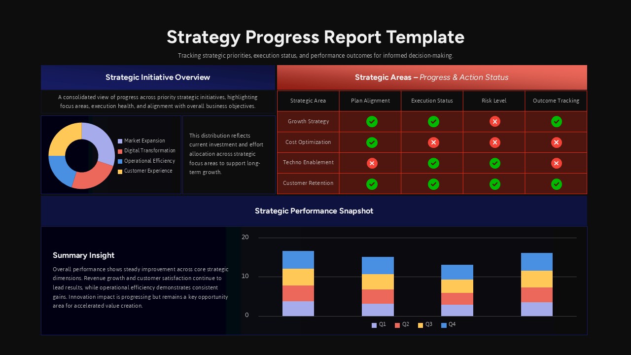 The bottom performance snapshot features a stacked column chart with quarterly data, enabling teams to compare results over time and identify trends. This strategy progress report dashboard presentation template is fully editable, allowing you to customize colors, labels, and metrics to reflect your business objectives while maintaining a professional and structured appearance across PowerPoint and Google Slides.