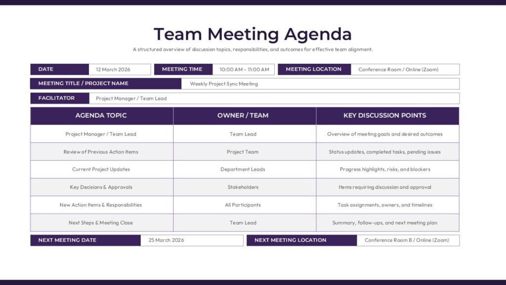 This team meeting agenda slide provides a clear, structured framework for planning and documenting productive meetings. The layout is organized into clearly labeled sections for date, time, meeting location, facilitator, and meeting title, followed by a detailed agenda table. The central table divides information into agenda topic, owner or team, and key discussion points, ensuring every item has accountability and purpose. Designed with a clean grid system and strong header contrast, this team meeting agenda helps audiences quickly scan priorities and responsibilities.