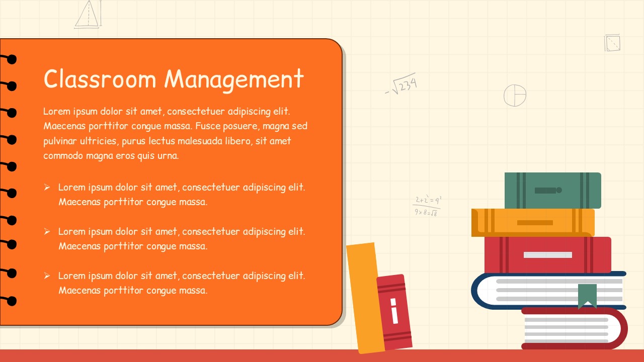 Deliver engaging academic content with this Teacher Education Illustration Deck Template for PowerPoint & Google Slides, designed to support modern classrooms, training sessions, and academic workshops. This Teacher Education Illustration Deck Template for PowerPoint & Google Slides features a warm red background with subtle grid patterns, playful school-themed icons, and a friendly illustrated teacher character that immediately sets an approachable, student-centered tone. The layout combines bold typography with structured content blocks, making it easy to present learning theories, child and adolescent development topics, teaching methods, and course outlines in a visually organized way.
