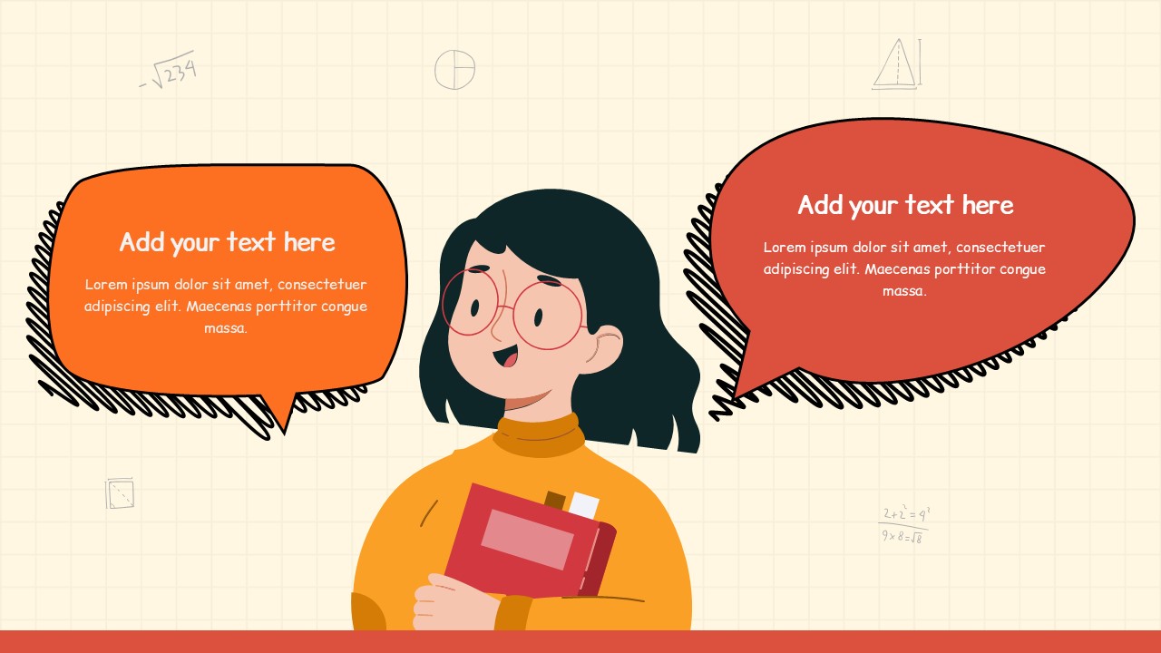 • Illustrated teacher character and school-themed icons for a friendly academic tone.