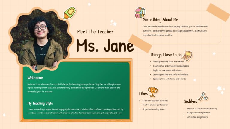 Perfect for the first day of school, parent orientation, or online classrooms, this meet the teacher introduction slide helps build trust and connection from the very beginning. By clearly communicating expectations and personality in a friendly format, it supports stronger relationships with students and families while saving preparation time. The balanced composition and thoughtful visuals make this slide suitable for both elementary and middle school settings.