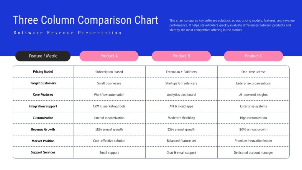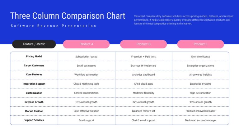 This Three Column Comparison Chart Template for PowerPoint & Google Slides is ideal for software companies, product managers, and business analysts presenting competitive analysis, feature comparisons, or product positioning. Perfect for board meetings, investor pitches, sales presentations, and strategic planning sessions where clear comparison of products, services, or solutions is essential. The template supports revenue performance metrics, market positioning data, and detailed feature differentiation effectively.