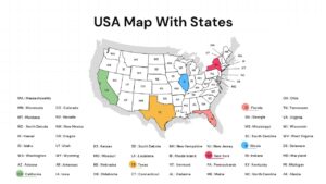 This USA map with states overview slide is designed to help presenters clearly visualize and communicate geographic information across the United States. Featuring a clean outline of all 50 states with clearly marked borders and postal abbreviations, this USA map with states layout makes regional data easy to understand at a glance. Selected states are highlighted in contrasting colors, allowing you to emphasize key locations, focus regions, or comparative insights without overwhelming the audience. The neutral background grid and balanced spacing ensure the map remains the central focus while preserving a professional, presentation-ready look.