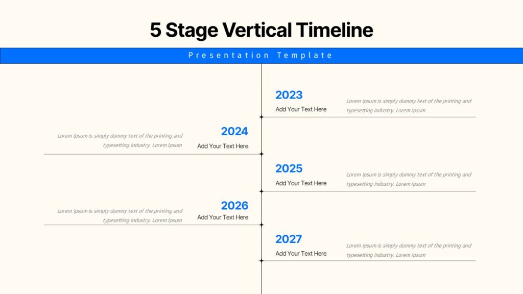 This 5 Stage Vertical Timeline Roadmap Template for PowerPoint & Google Slides is designed to help you present sequential milestones with clarity, structure, and strong visual balance. The slide features a clean vertical axis, allowing each phase to be displayed in a simple left-right alternating layout. This approach supports easy reading and helps your audience follow the progression smoothly. The template’s minimal and modern styling ensures full compatibility with corporate, educational, and project-driven presentations while maintaining a visually appealing composition that keeps the focus on your content. Throughout the layout, you can customize dates, headings, and supporting descriptions, enabling you to adapt the timeline for planning, strategy sessions, project reviews, or annual reporting needs.