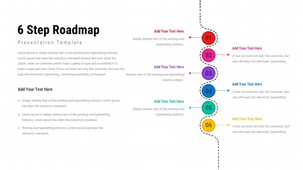 The Six Step Timeline Roadmap is ideal for illustrating chronological processes, product development cycles, business roadmaps, or learning programs. Its clean composition ensures readability, while the color-coded markers bring energy and clarity to the narrative. Users can easily adjust fonts, colors, and content, making the slide adaptable for corporate updates, training sessions, planning workshops, and stakeholder briefings. With its modern and professional look, this roadmap template helps streamline communication, enhance storytelling, and support presenters in delivering structured, high-level insights with confidence.