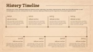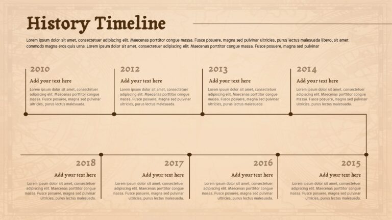 Each milestone includes a date, headline, and descriptive text area, allowing presenters to add context while keeping information concise. The connected line and node structure visually reinforces progression and continuity, helping viewers understand cause-and-effect relationships across different periods. This history timeline presentation balances decorative design with readability, ensuring content remains the focus while benefiting from an engaging vintage aesthetic.